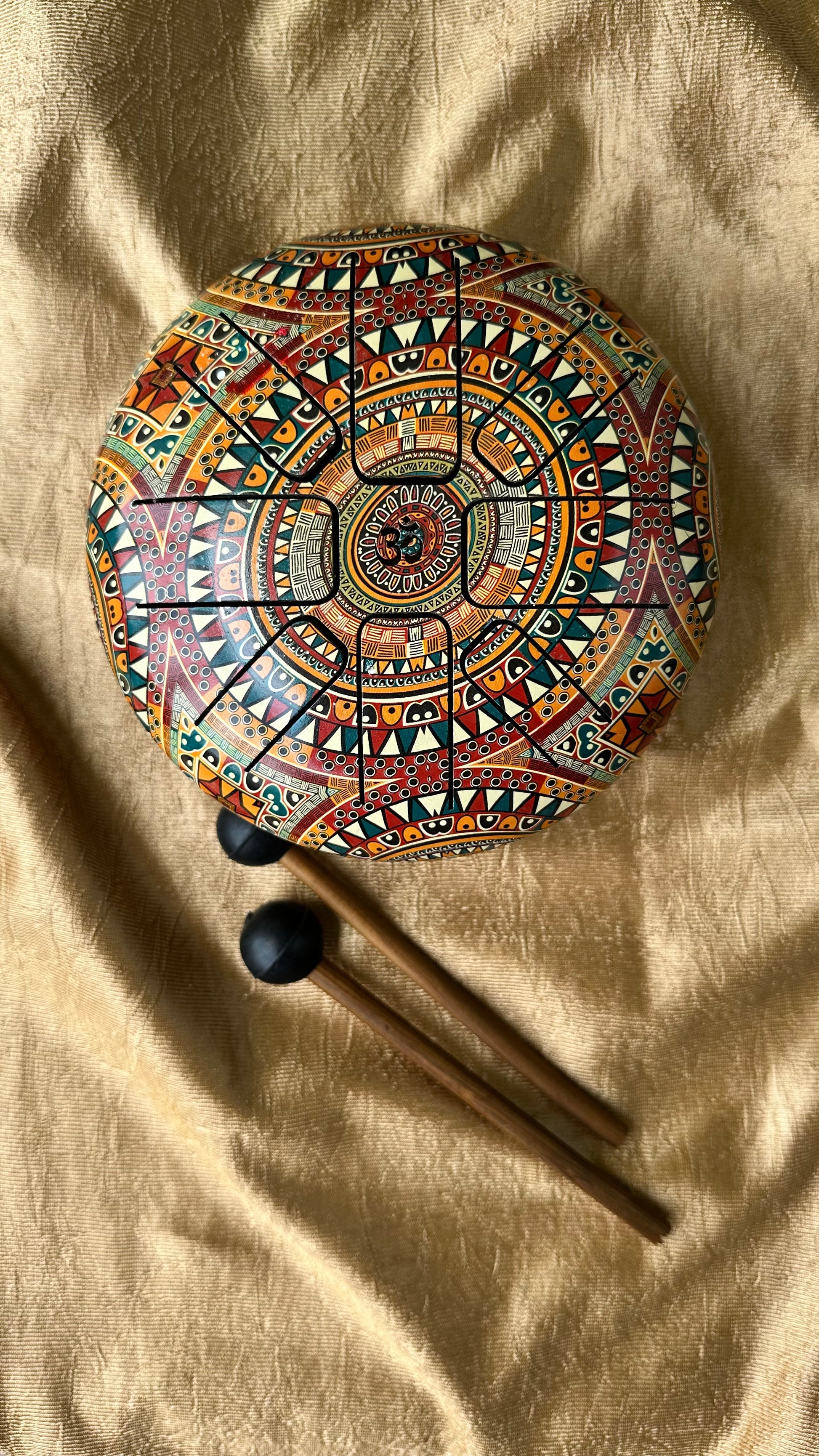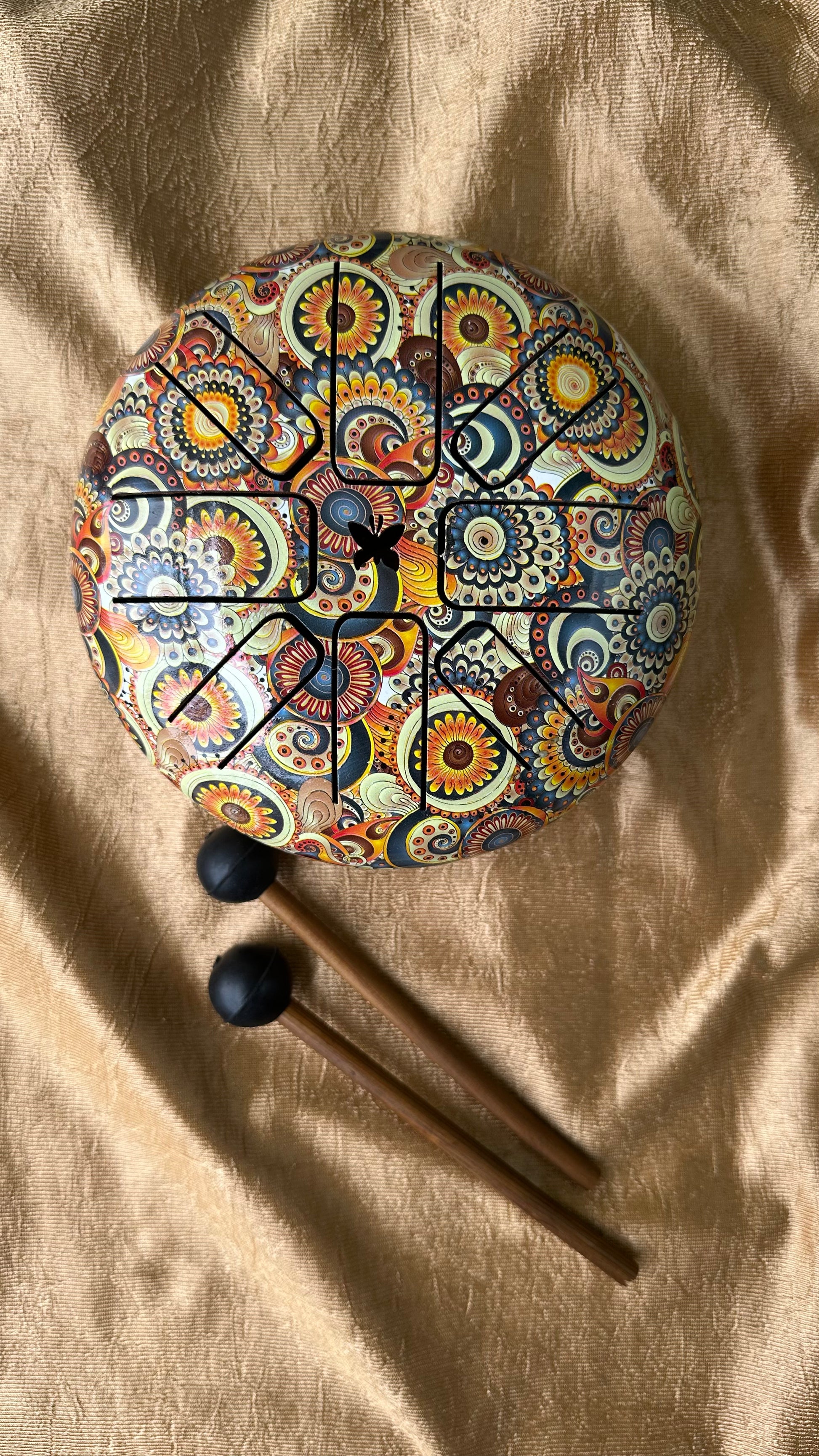 The Happy Drum, also known as a Steel Tongue Drum or Tank Drum, is a beautifully crafted melodic percussion instrument made from high-quality steel. With its soothing, bell-like tones and elegant, minimalist design, the Happy Drum is both a musical instrument and a piece of art. Tuned to a specific musical scale, each tongue (cut-out area on the top surface) produces a rich, resonant note when struck with fingers or soft mallets.