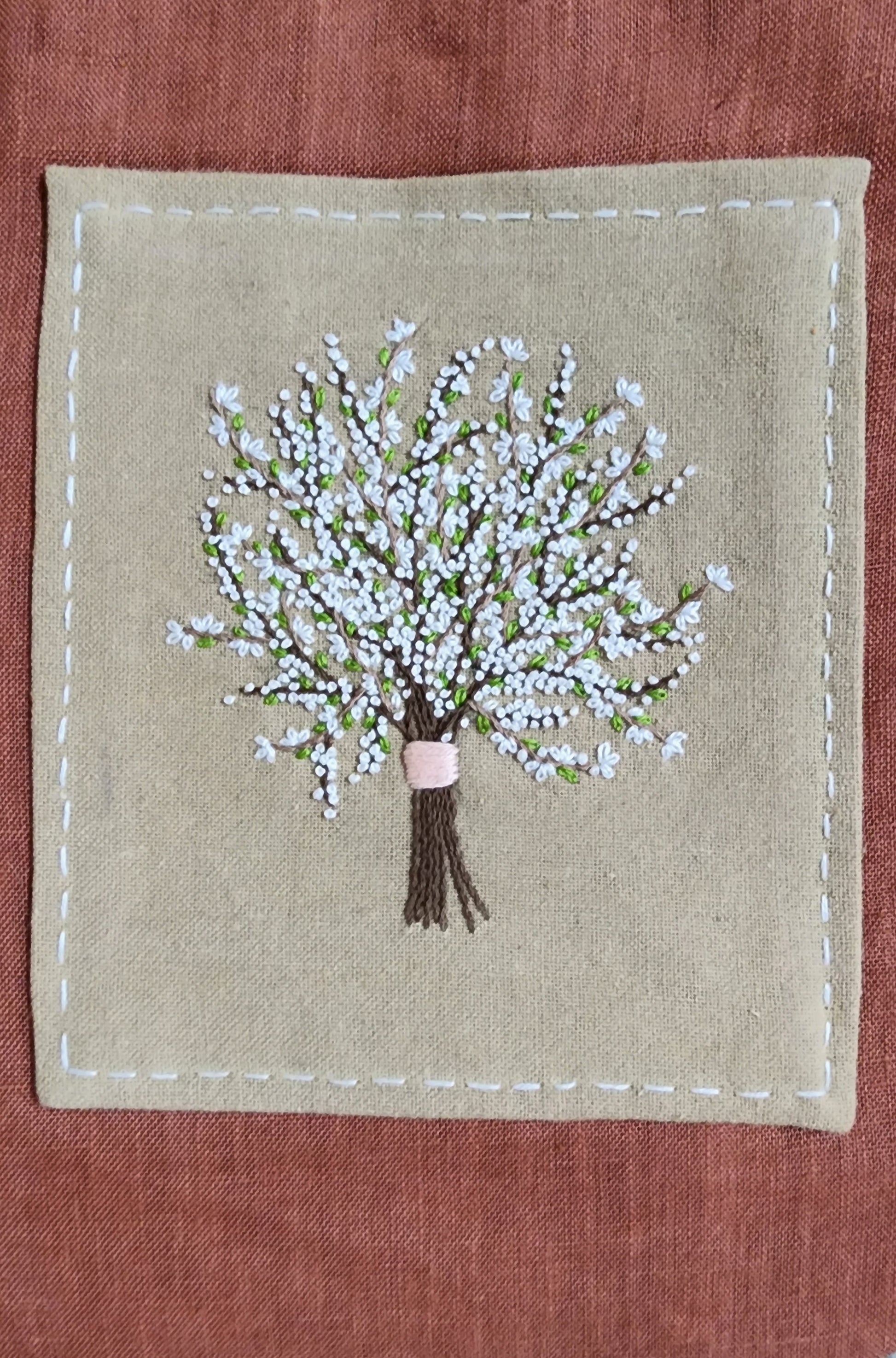 Our hand embroidered tote bags are made of linen (outer shell) with cotton lining. Each bag has two pockets on the inside. A magnetic button is also placed in the center to shut the opening. The bag is fused so they are stiff. Each bag comes with a drawstring bag made of our remnant fabric, which is apart of our recycle project.