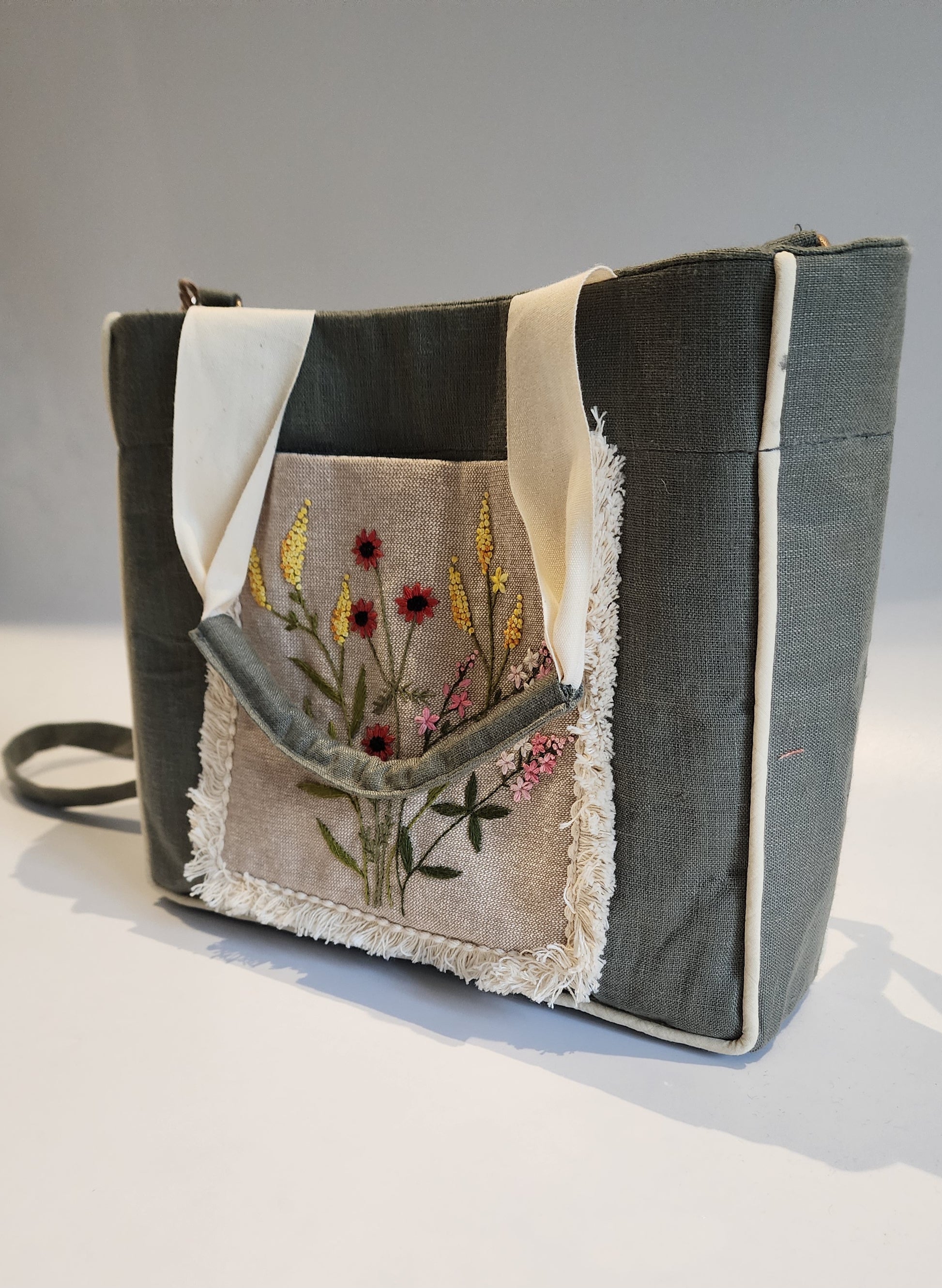 Our Kumstu bo bag is hand-embroidered. It has a linen (outer shell) with cotton inner lining. Each bag has two pockets on the inside. A magnetic button is also placed in the center to shut the opening. The bag is fused so it is stiff and holds its shape.