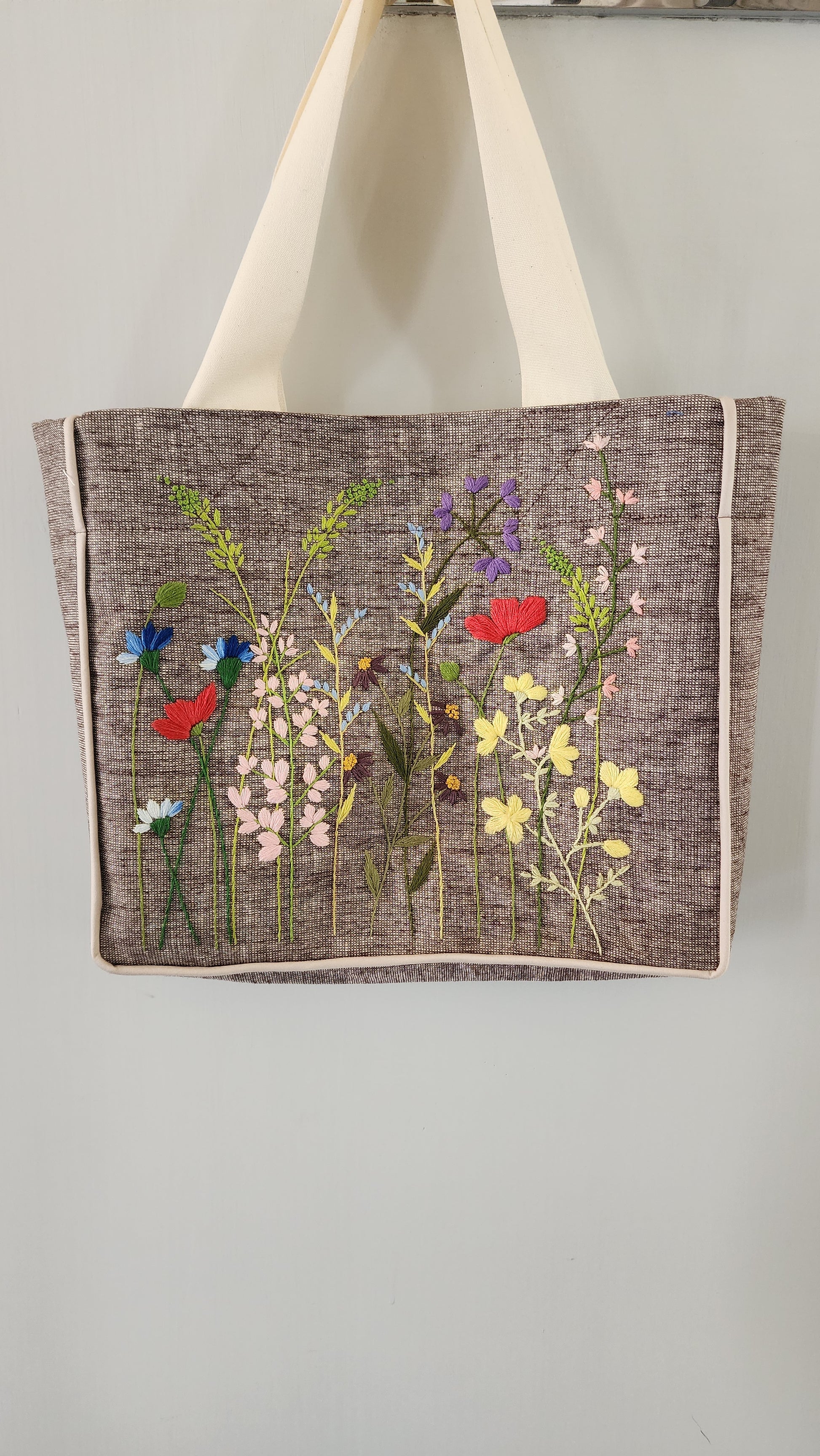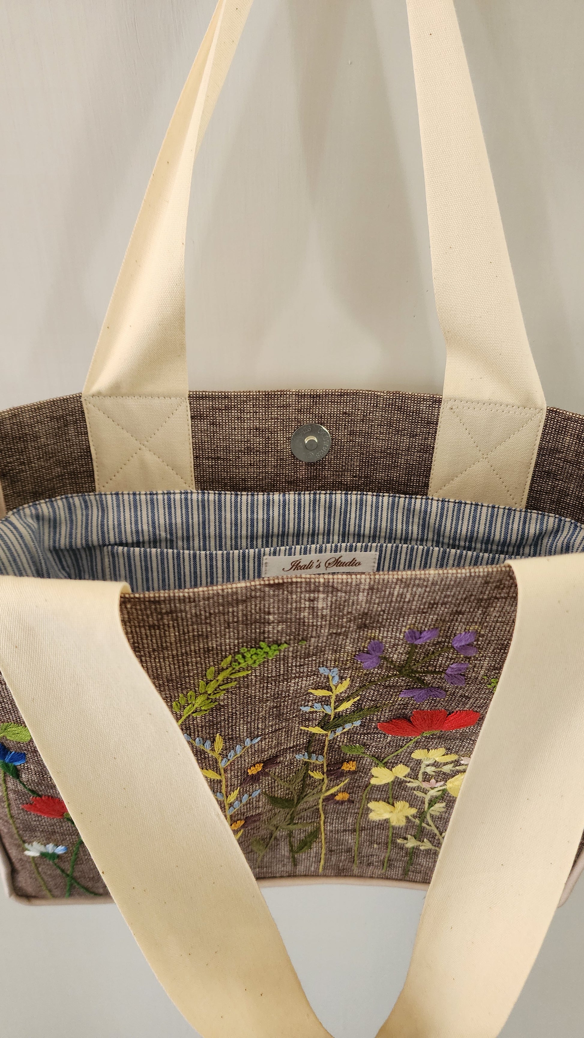 Our Kumstu bo bag is hand-embroidered. It has a linen (outer shell) with cotton lining. Each bag has two pockets on the inside. A magnetic button is also placed in the center to shut the opening. The bag is fused so it is stiff and holds its shape.