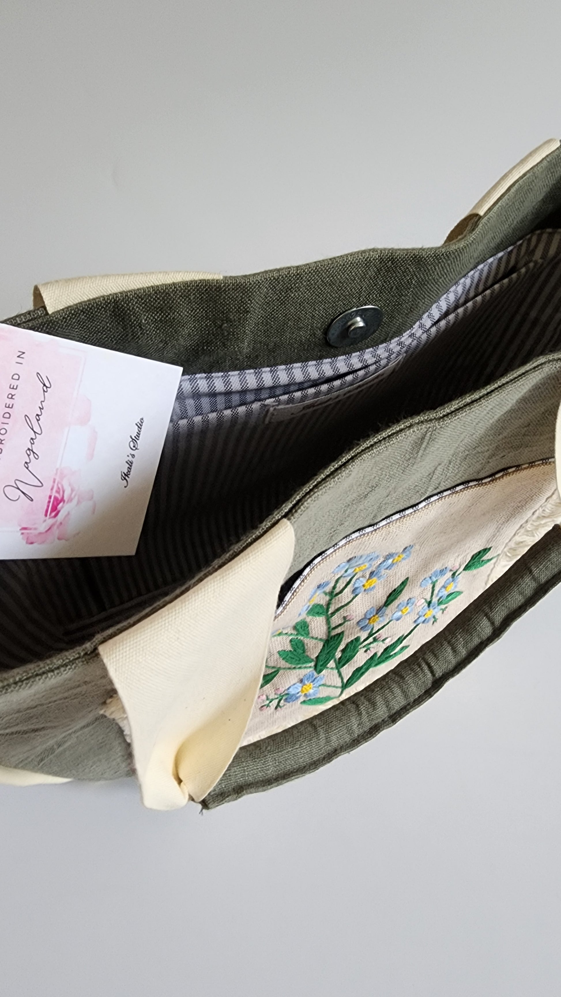 Our Kumstu bo bag is hand-embroidered. It has a linen (outer shell) with cotton inner lining. Each bag has two pockets on the inside. A magnetic button is also placed in the center to shut the opening. The bag is fused so it is stiff and holds its shape.