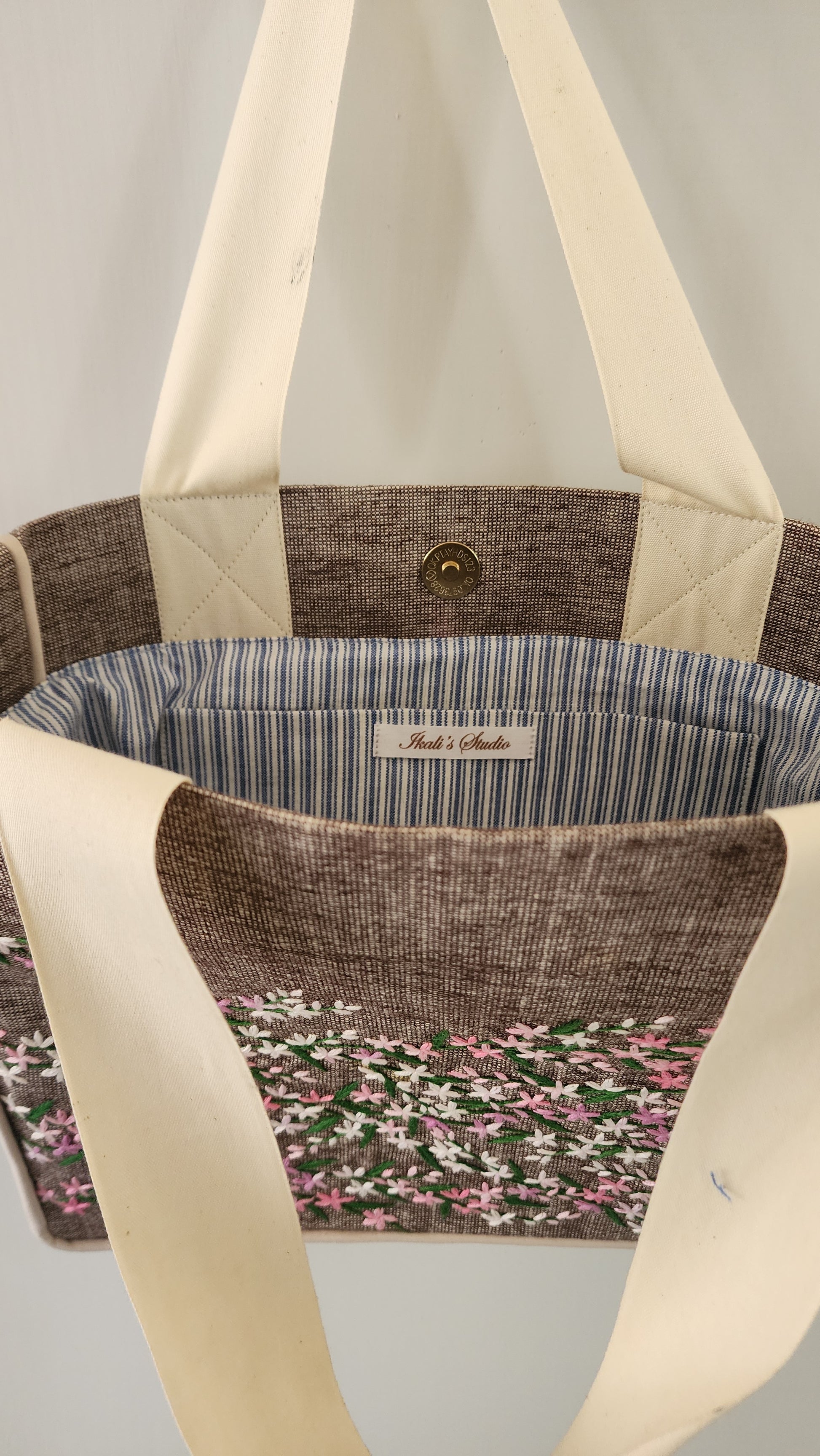 Our Kumstu bo bag is hand-embroidered. It has a linen (outer shell) with cotton lining. Each bag has two pockets on the inside. A magnetic button is also placed in the center to shut the opening. The bag is fused so it is stiff and holds its shape.