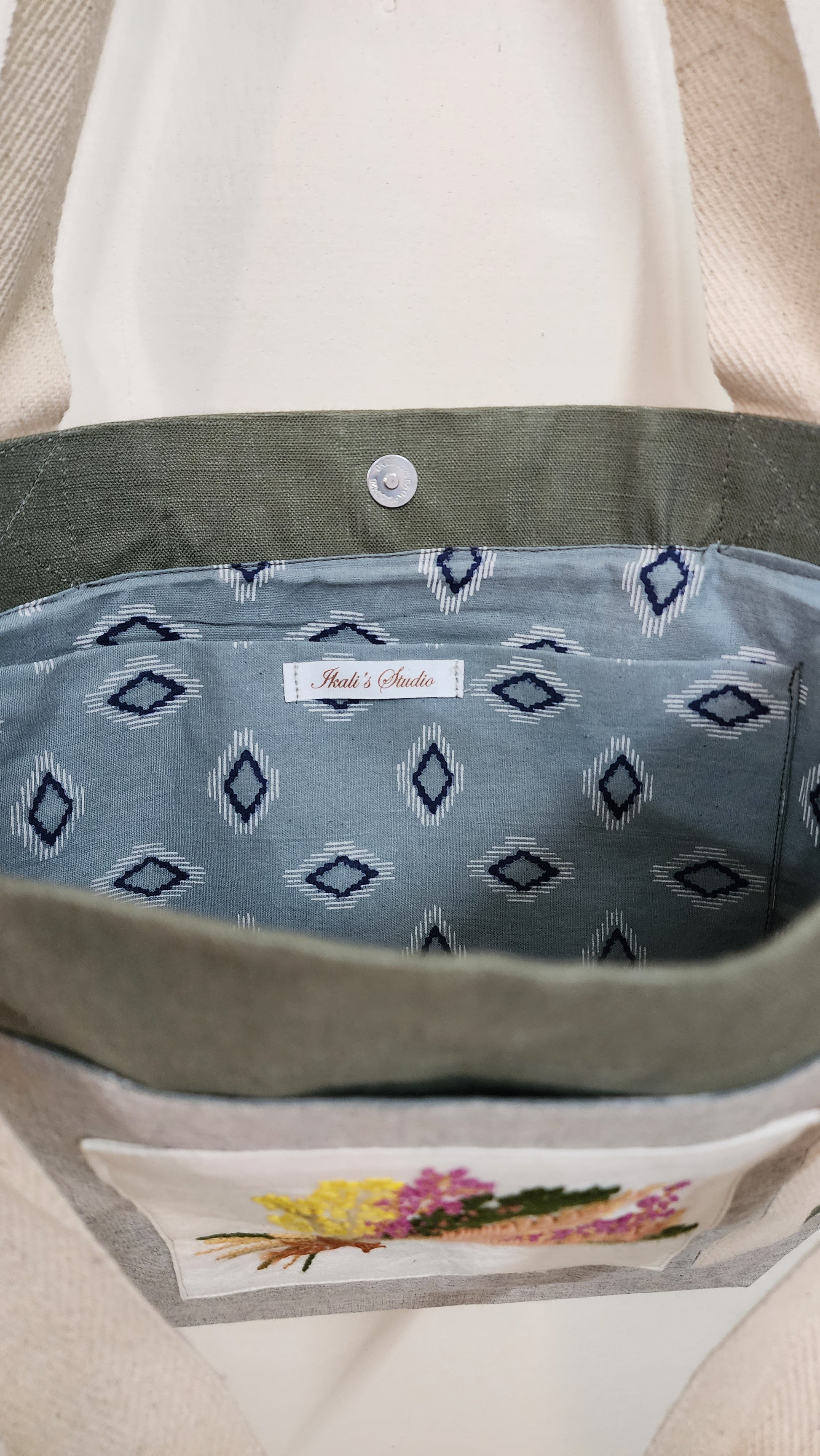 Our hand embroidered tote bags are made of linen (outer shell) with cotton lining. Each bag has two pockets, one on the inside and the other on the outside. A magnetic button is also placed in the center to shut the opening. The bag is fused so they are stiff. Each bag comes with a drawstring bag made of our remnant fabric, which is apart of our recycle project.