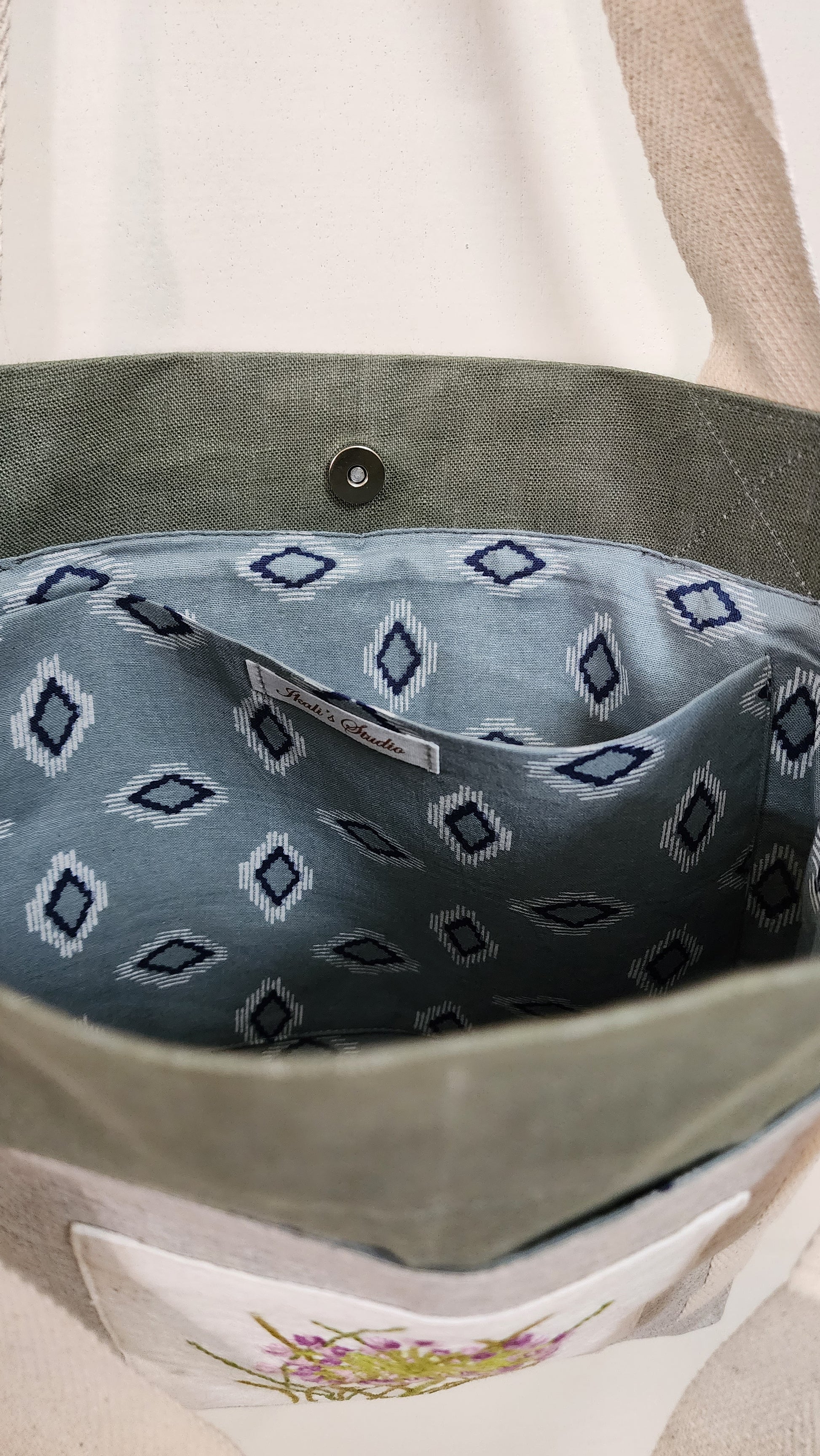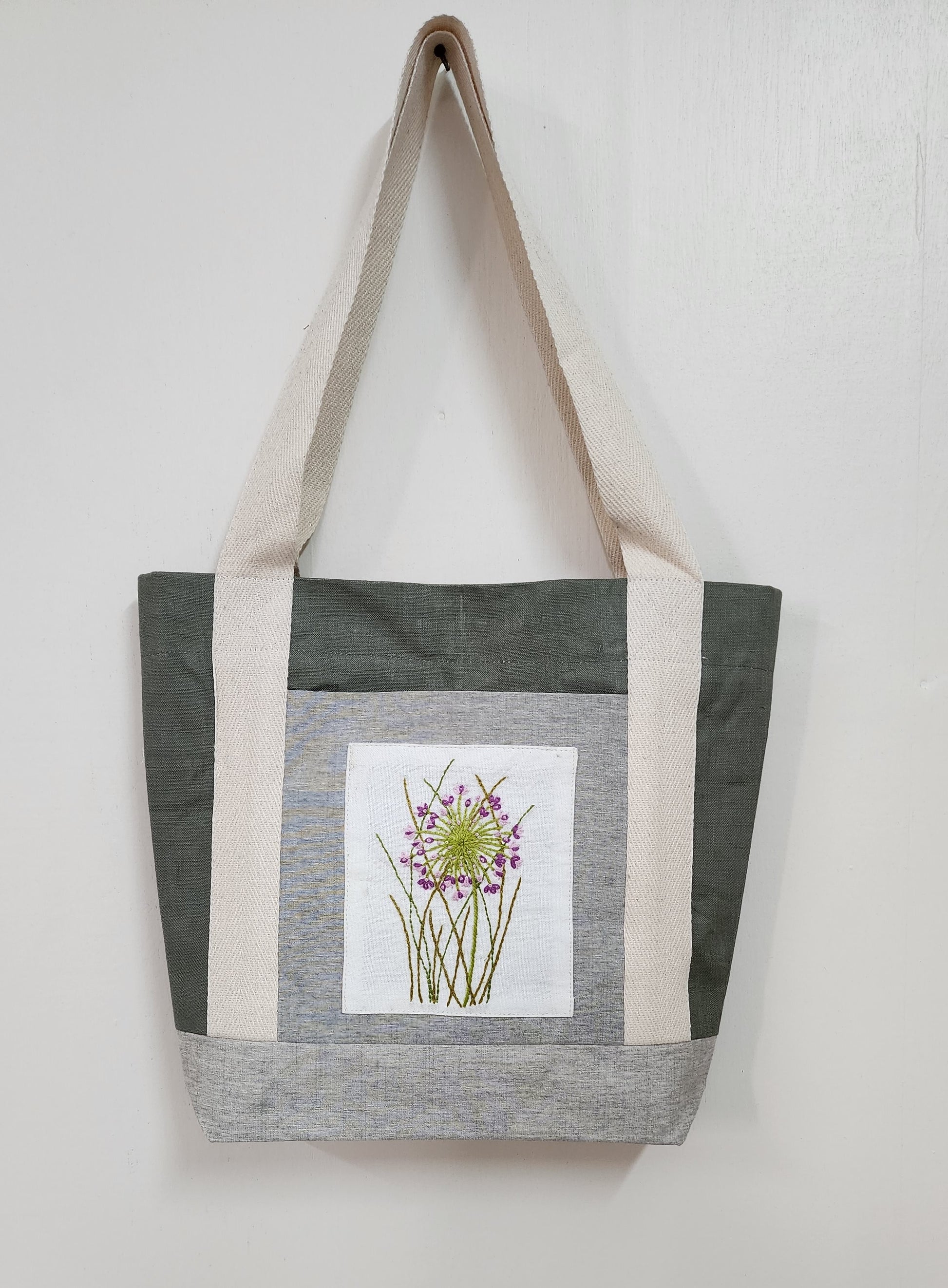 Our hand embroidered tote bags are made of linen (outer shell) with cotton lining. Each bag has two pockets, one on the inside and the other on the outside. A magnetic button is also placed in the center to shut the opening. The bag is fused so they are stiff. Each bag comes with a drawstring bag made of our remnant fabric, which is apart of our recycle project.