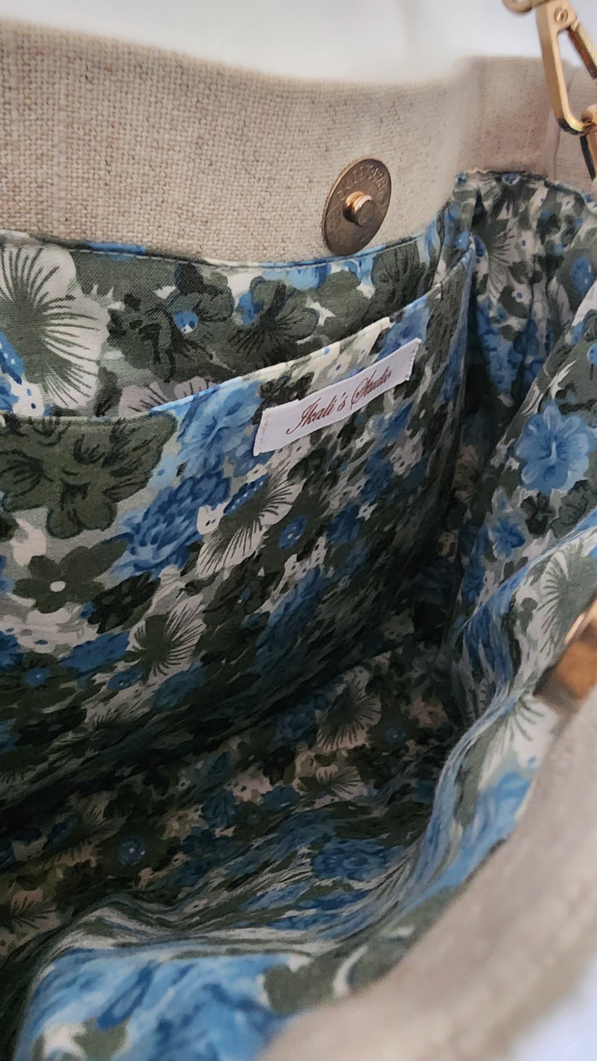 Our Kumstu bo bag is hand-embroidered. It has a linen (outer shell) with cotton lining. Each bag has two pockets on the inside. A magnetic button is also placed in the center to shut the opening. The bag is fused so it is stiff and holds its shape.