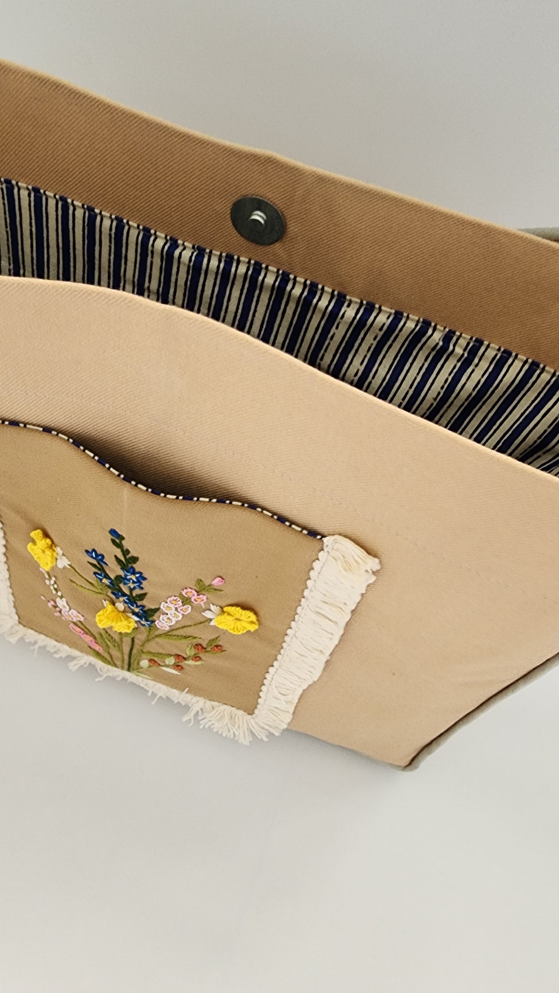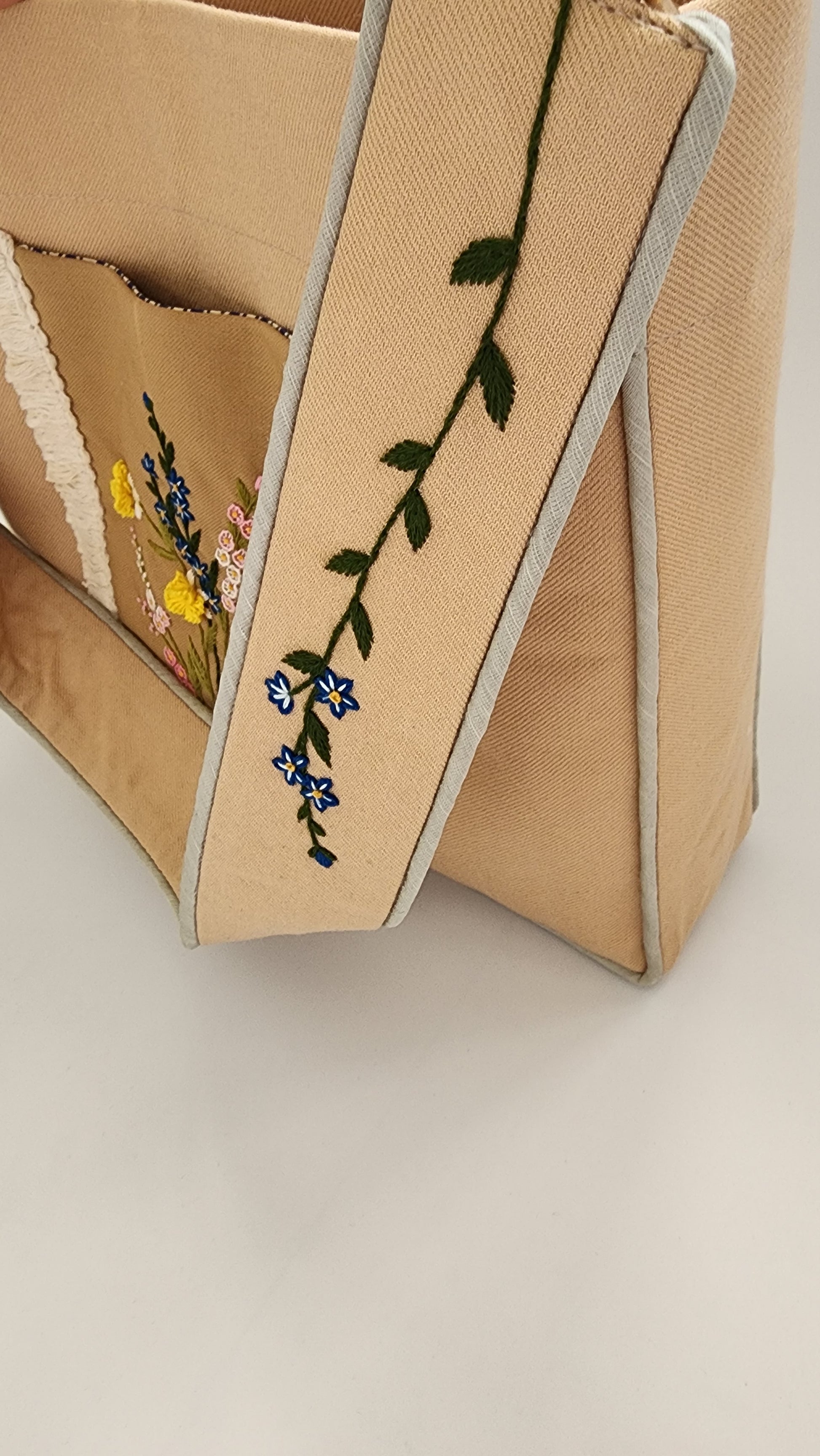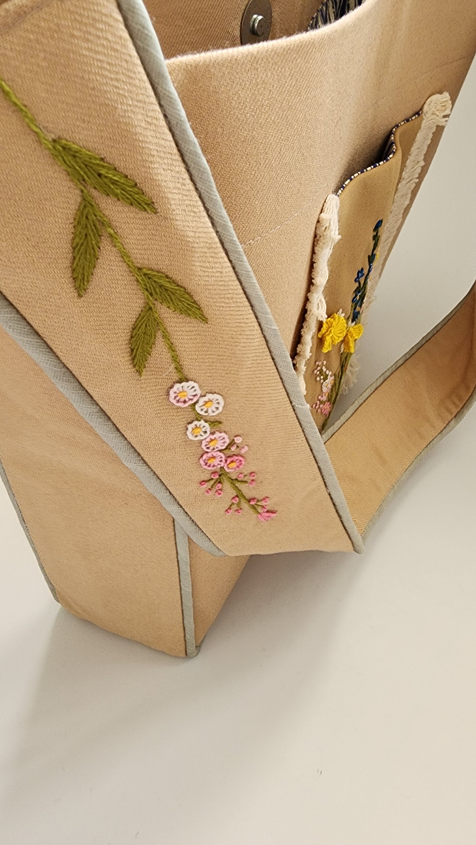 The bag has a linen (outer shell) with cotton inner lining and is washable. The wide shoulder strap is also embroidered. Each bag has two pockets on the inside. A magnetic button is also placed in the center to shut the opening. The bag is fused so it is stiff and holds its shape.