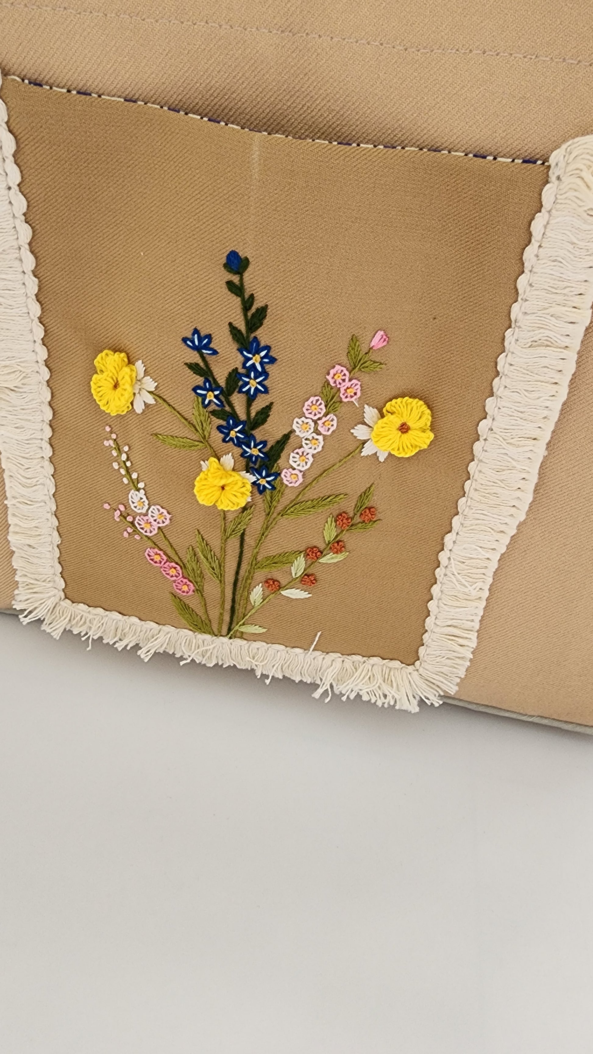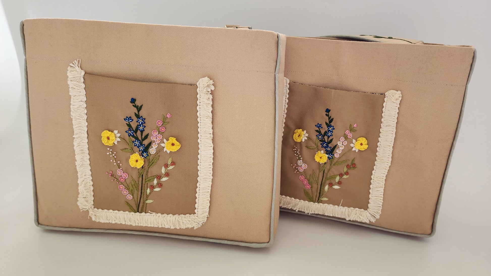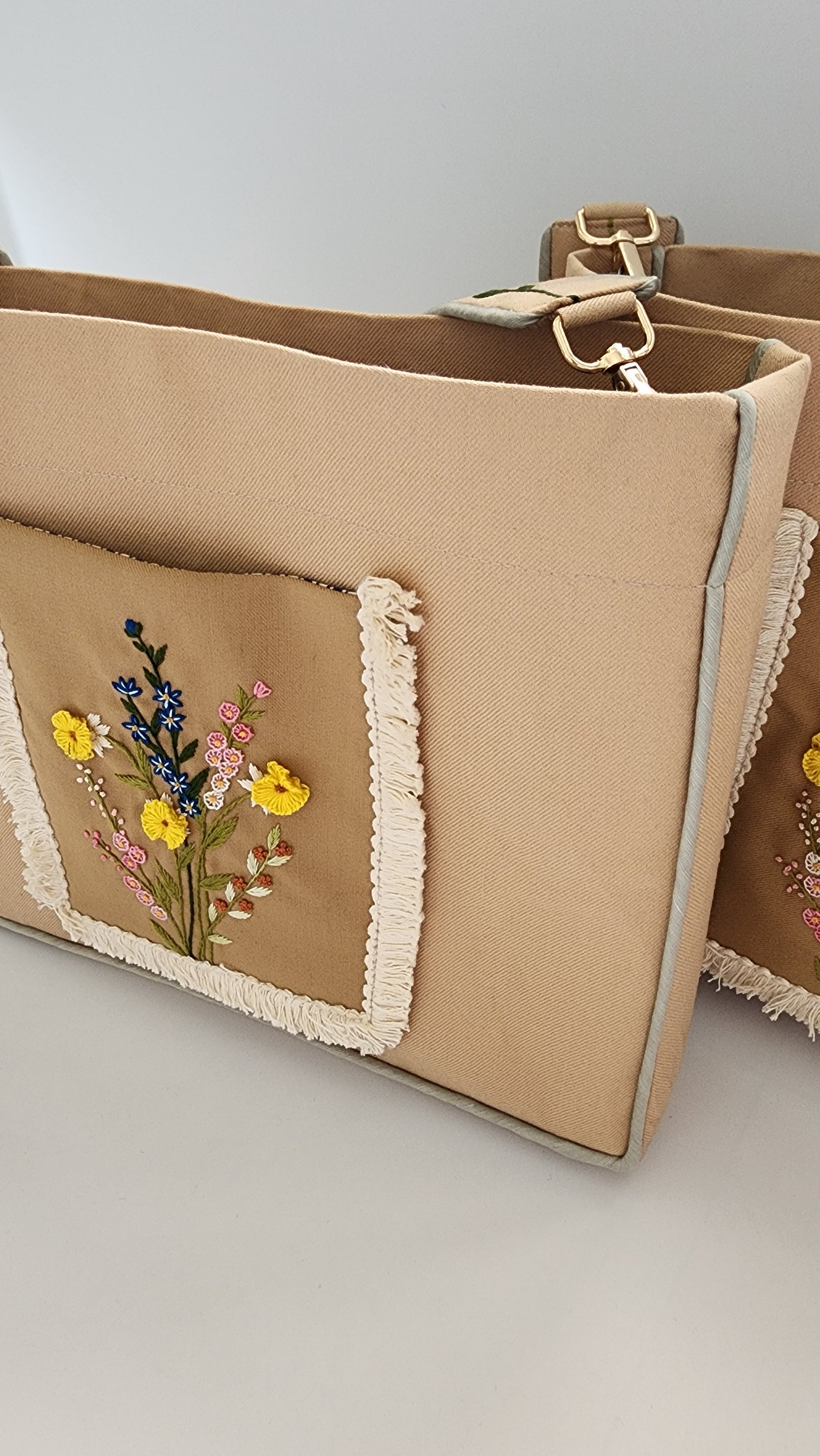 The bag has a linen (outer shell) with cotton inner lining and is washable. The wide shoulder strap is also embroidered. Each bag has two pockets on the inside. A magnetic button is also placed in the center to shut the opening. The bag is fused so it is stiff and holds its shape.