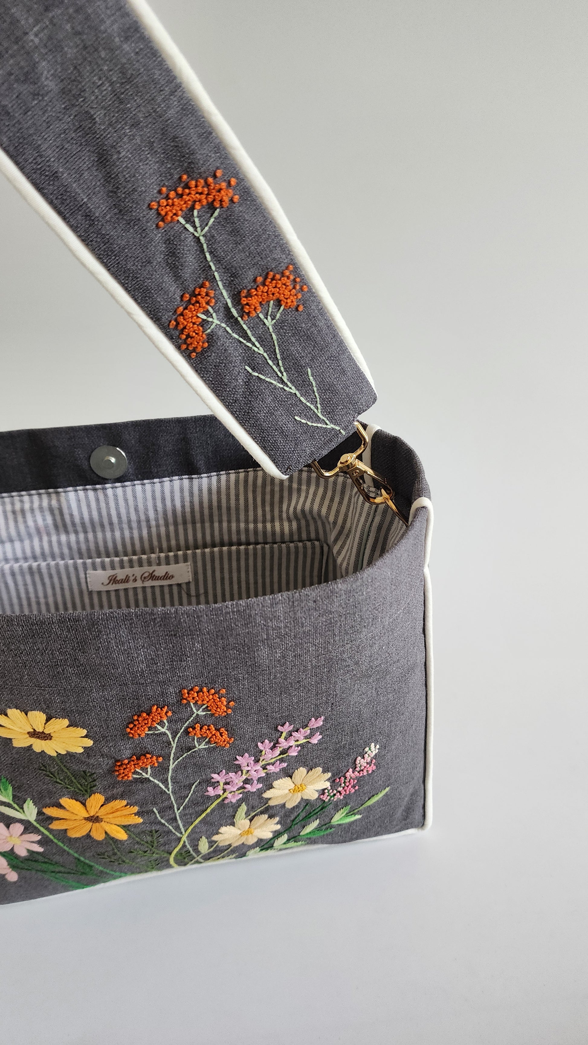 The bag has a linen (outer shell) with cotton inner lining and is washable. The wide shoulder strap is also embroidered. Each bag has two pockets on the inside. A magnetic button is also placed in the center to shut the opening. The bag is fused so it is stiff and holds its shape.