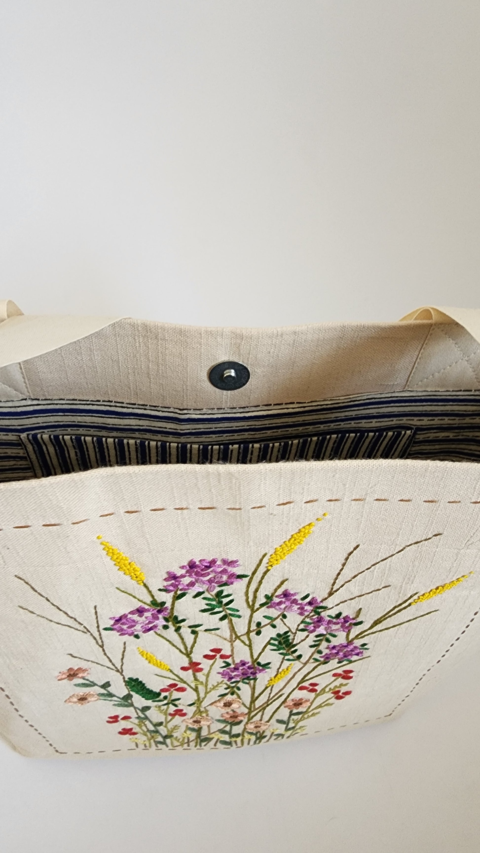 Our hand-embroidered tote bags are made of linen (outer shell) with cotton lining. Each bag has two pockets on the inside. A magnetic button helps close the bag. The bag is fused so it is stiff and retains its shape.